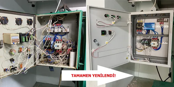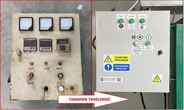 - Projede kapsamında plastik malzemeyi ısıtarak kalıp formuna dönüştürmeye yarayan rotasyon makinelerinin eski ve kullanışsız elektrik panoları yenilenmiştir. İş sağlığı için tehlike oluşturabilecek karmaşık yapıdaki güvenliksiz pano tamamen değiştirilmiştir.